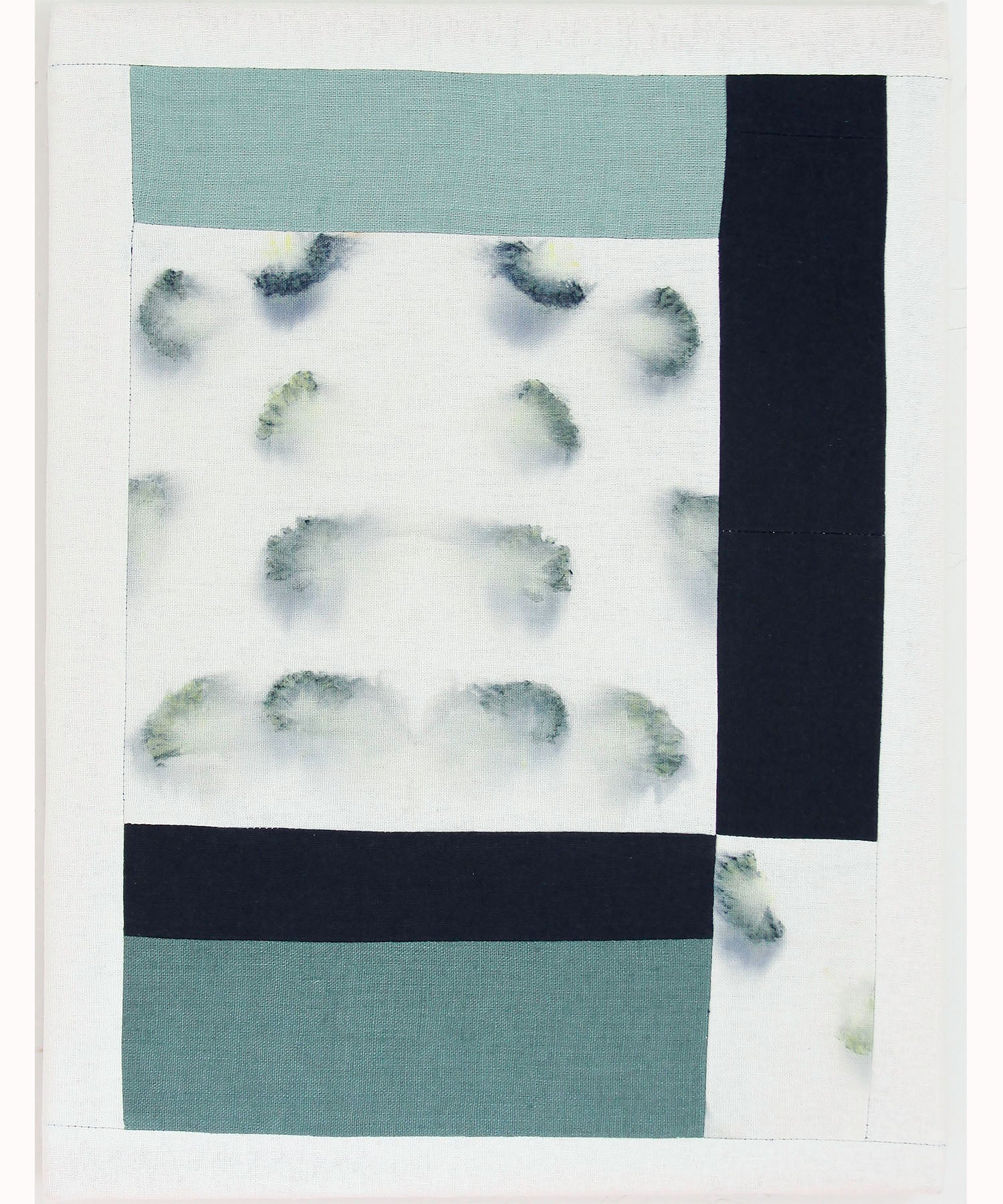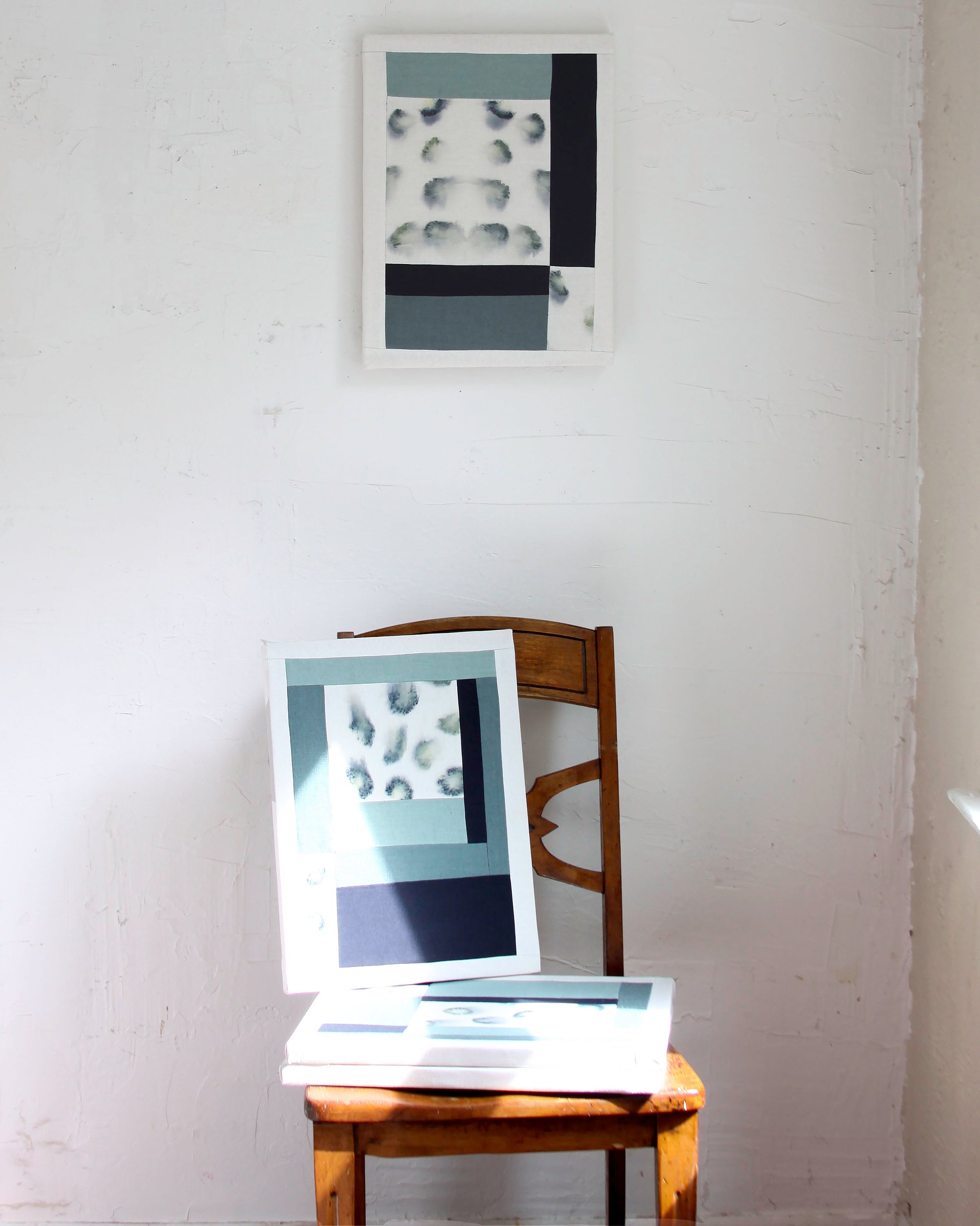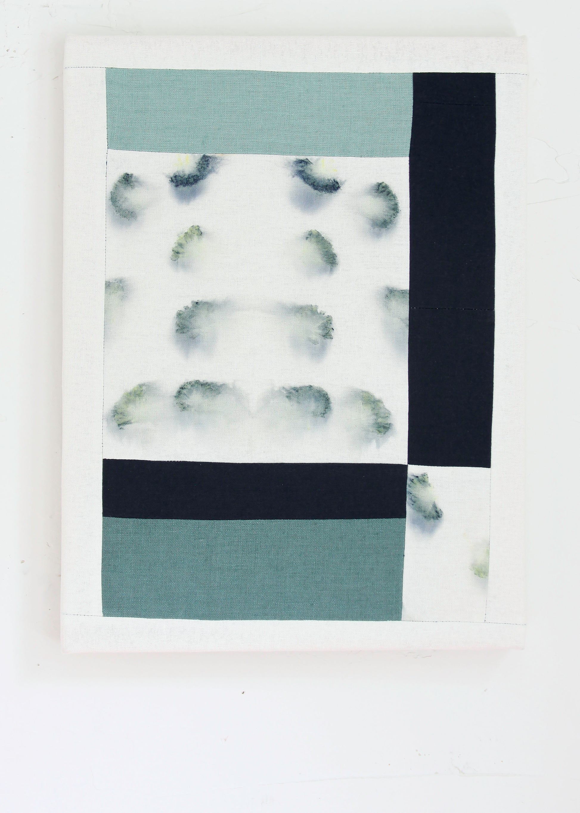 One of a kind patchwork textile study made with purple pincushion flower (scabiosa) ecoprint, navy blue and mixed turquoise linens. Stretched on bars, 12" x 16"