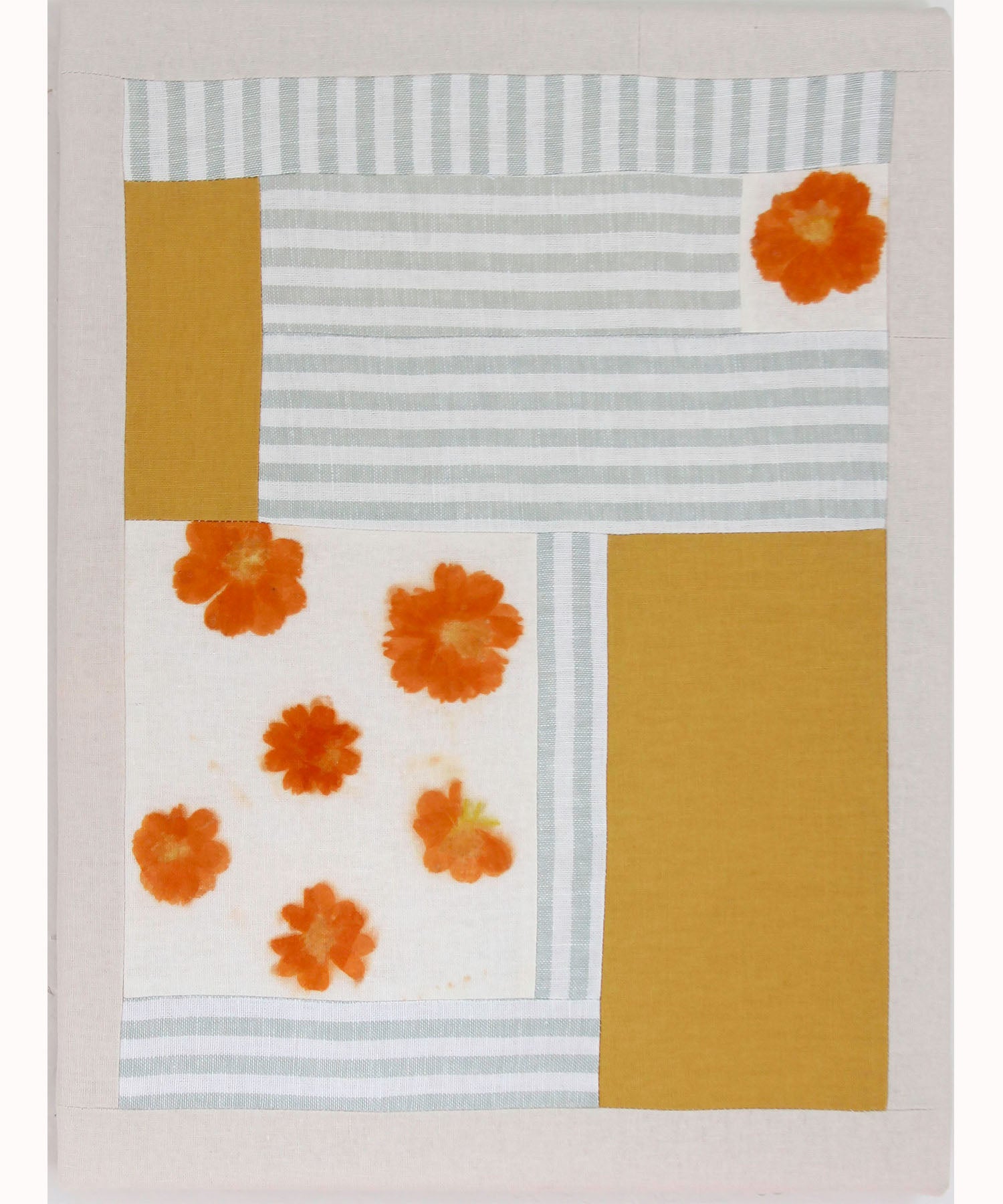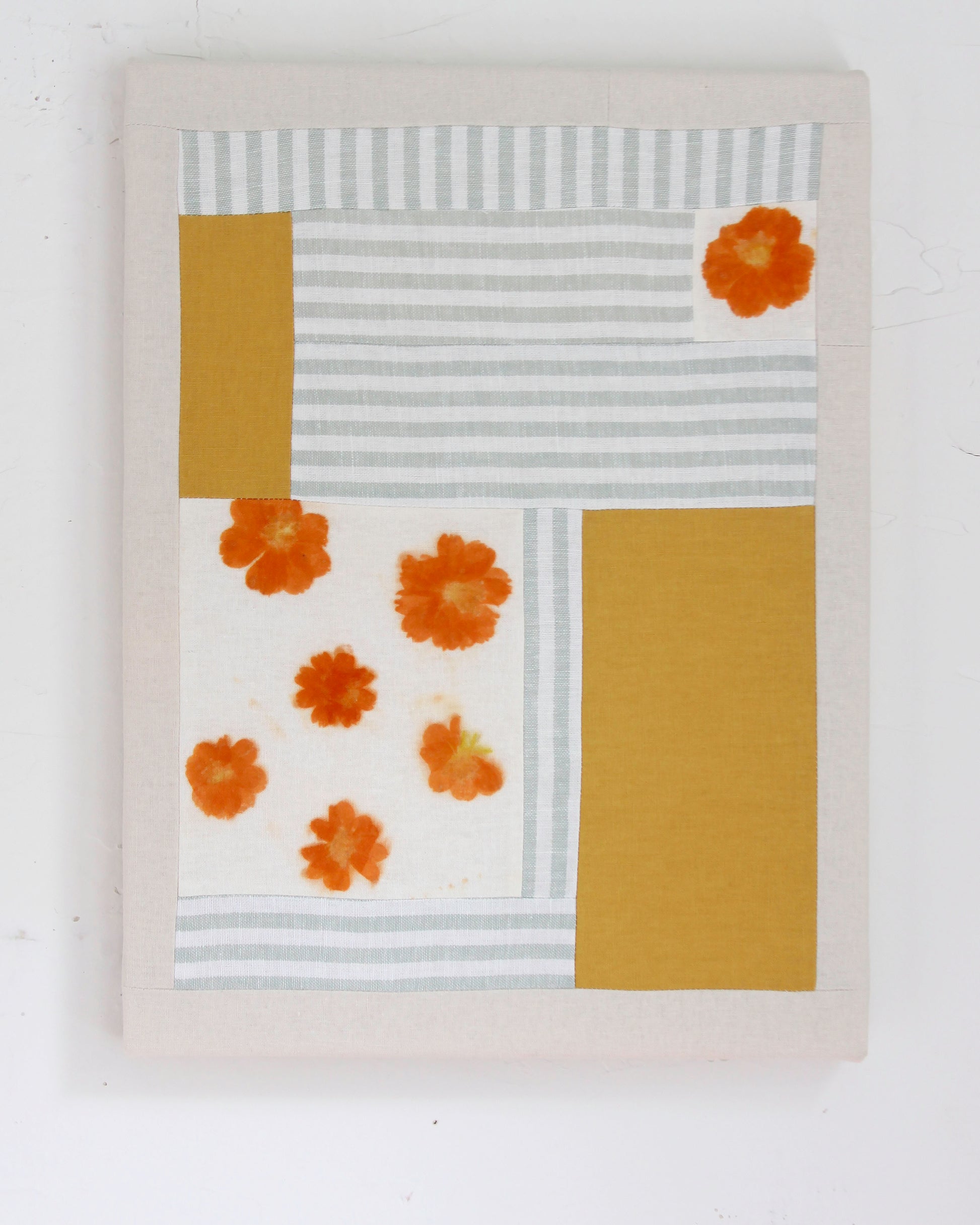 One of a kind patchwork textile study made with tango cosmo ecoprint, golden yellow linen and green/white striped fabric. Stretched on bars, 12" x 16"