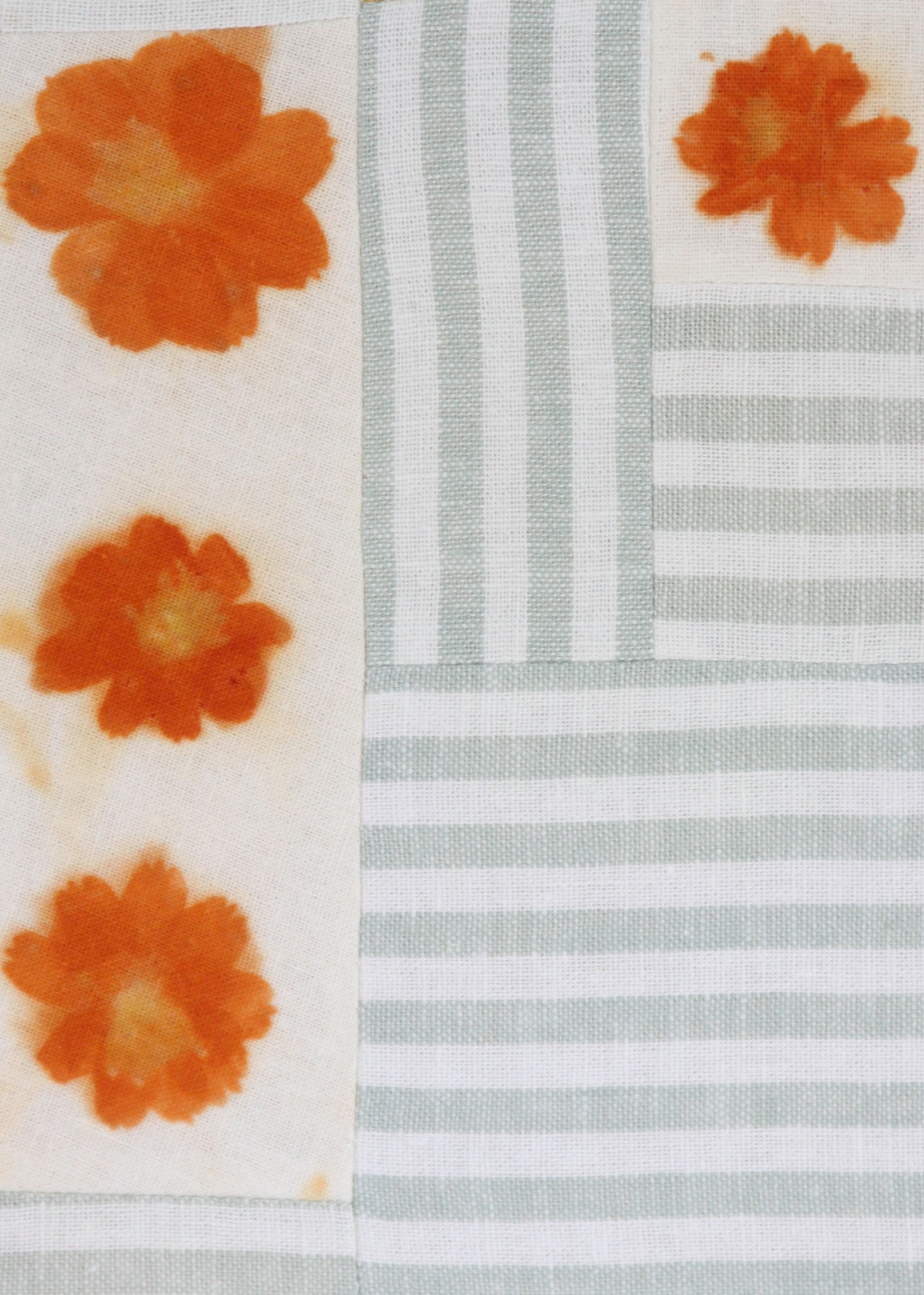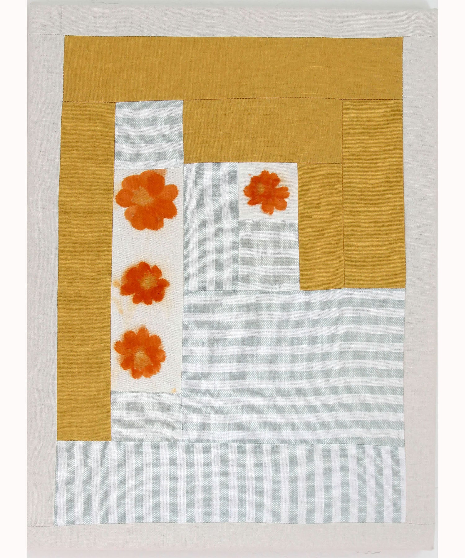 One of a kind patchwork textile study made with tango cosmo ecoprint, golden yellow linen and green/white striped fabric. Stretched on bars, 12" x 16"